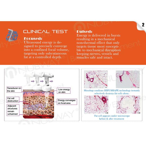 HIFUSHAPE adopts High Intensity Focused Ultrasound (HIFU), which deliver focused energy at a precise depth and disrupts localized fat deposits. It's a non-invasive way for fat reduction and body contouring of the abdomens, thighs and flanks, which offers patients' satisfactory experience with impressive and long last effects.